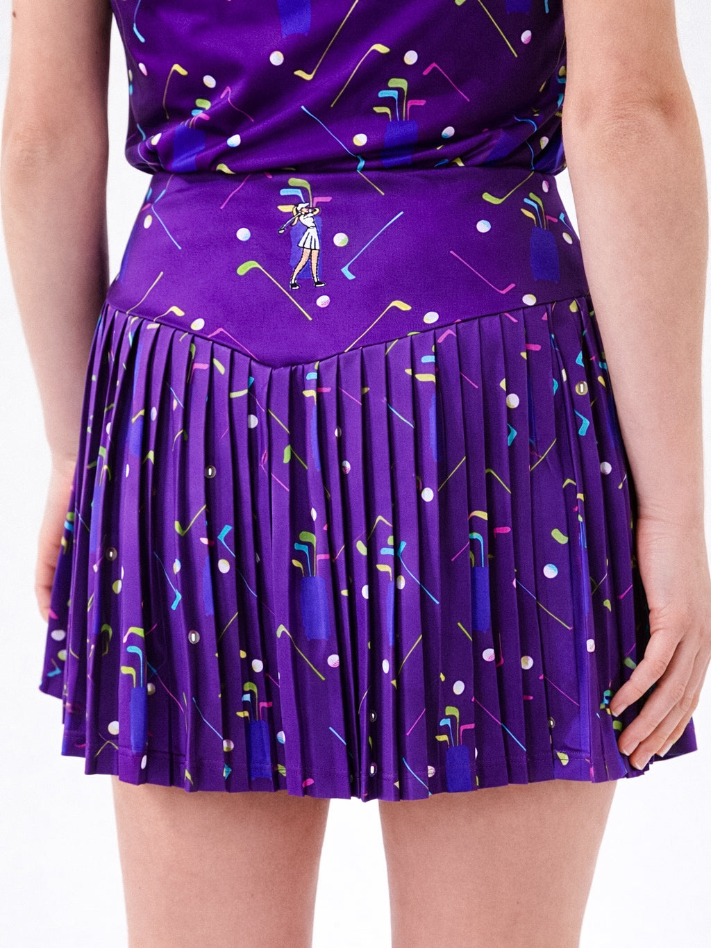 Be the brightest star game with our ultra-trendy purple polo and skirt set, designed for true golf enthusiasts. This eye-catching ensemble features a vibrant print that adds a touch of flair to your on-course attire. Crafted from high-quality materials, the set promises exceptional durability. Whether you're teeing off or enjoying a casual day out, this stylish outfit combines comfort and functionality. Experience the perfect blend of fashion and performance, making every swing a statement.