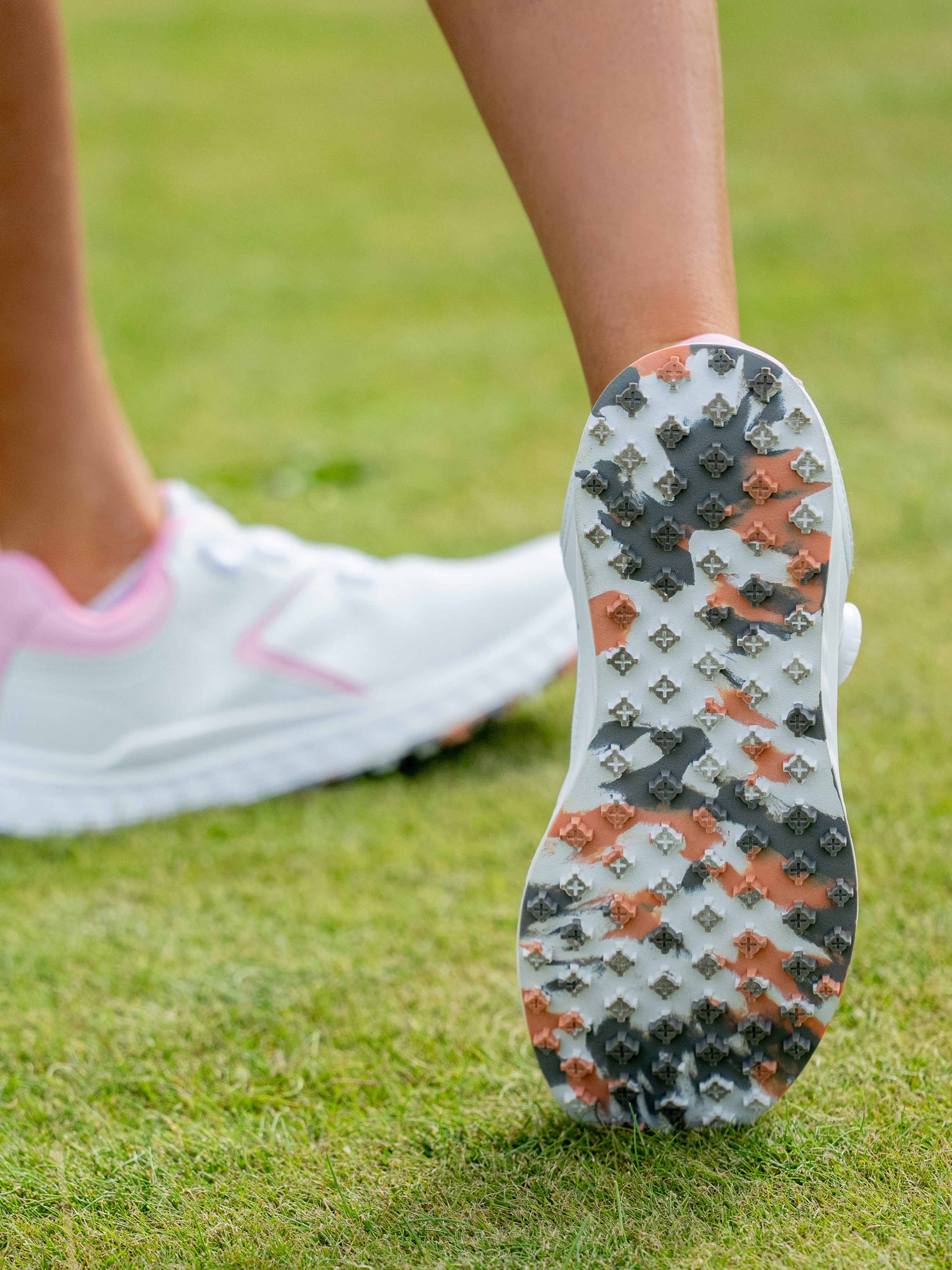 Reliable and comfortable sneakers are the foundation of any golfer’s wardrobe. We’ve developed a special sole with improved grip, guaranteeing confidence with every step on any surface. The ergonomic insole and shock-absorbing outsole reduce foot strain, providing support throughout the game. The simple fastening is specially designed for easy on and off. The lightweight composition helps conserve energy, keeping you at your best all day long.