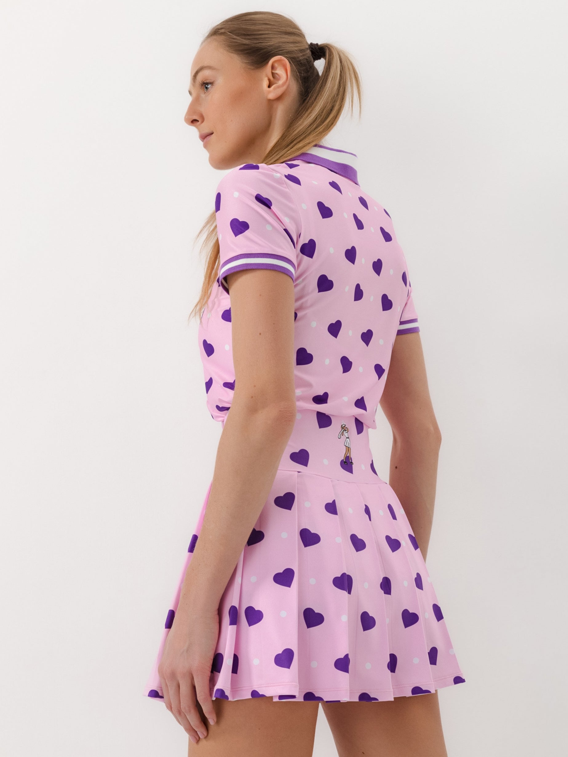 La estrella indiscutible de nuestra colección morada es el conjunto Romance: la combinación de polo y falda que es brillante, audaz y verdaderamente única. Abre tu corazón al nuestro y abraza el espíritu juguetón de este look.