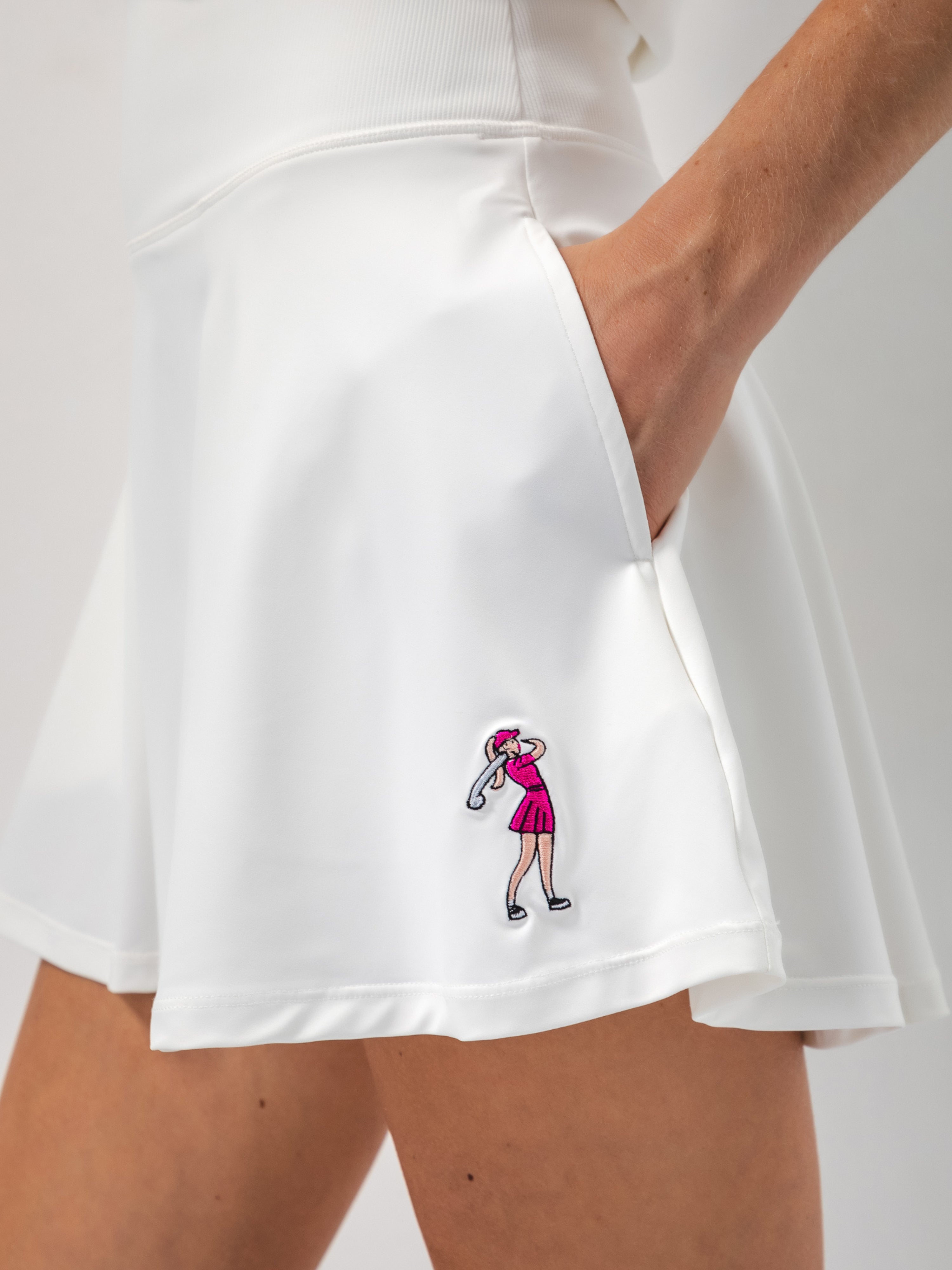 The ultimate golf skirt for comfort and performance. Its A-line shape allows for effortless movement, while the wide waistband provides a secure and flattering fit. Made from soft, breathable fabric, it feels great against the skin. Practical pockets add convenience, and the well-balanced composition ensures the skirt retains its shape even after multiple dry cleanings.